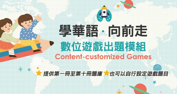In order to enrich the digital materials of "Let's Learn Mandarin(For Children )" and respond to teachers’ feedback, the Overseas Community Affairs Council launches "Content-customized Games". Each game includes a question bank from "Let's Learn Mandarin(For Children )" Book 1 to 10, and teachers can also create their own question set. These games are suitable for classroom instruction or guiding students to self-study.