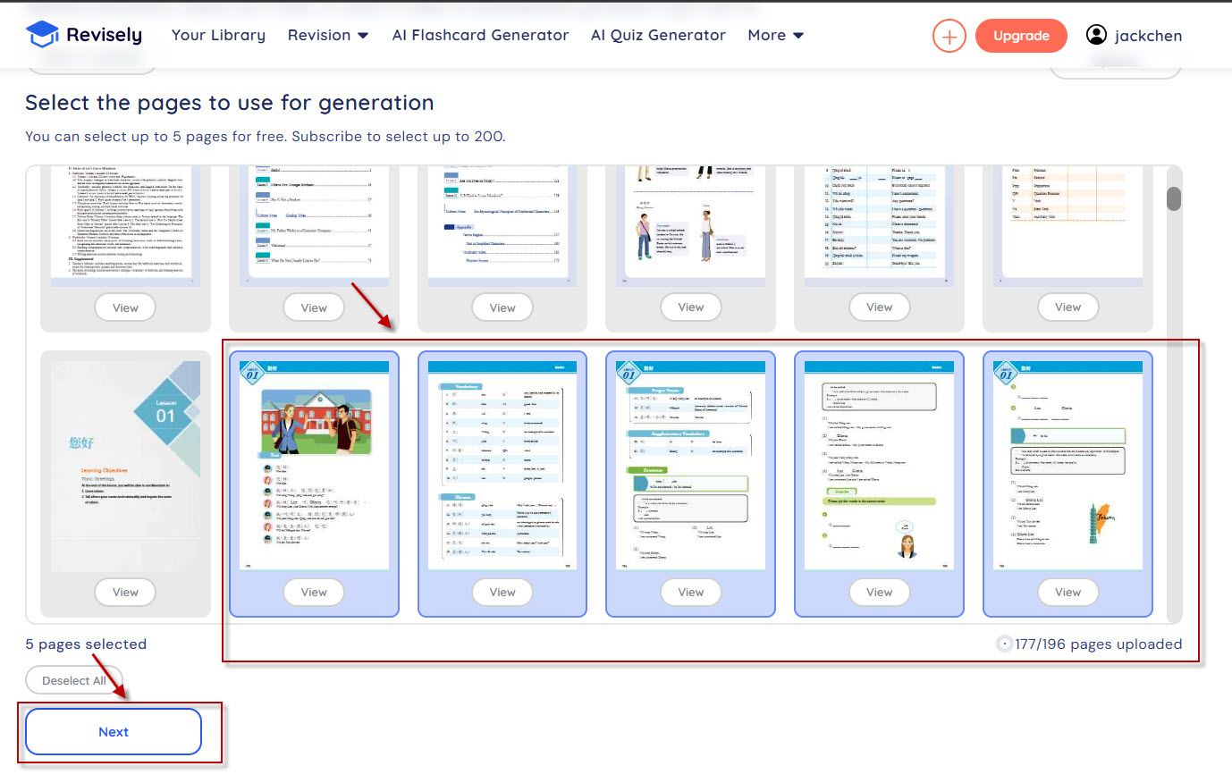 步驟3:完成教材檔案(084.來學華語課本第一冊.pdf)文件上傳後,可以在介面上看到上傳的頁面,最多可以選擇5個page(免費方案)來做為出題內容:(本次範例選擇Lesson1前五個頁面做為出題來源),選取完頁面後選擇「Next」進行下一步。