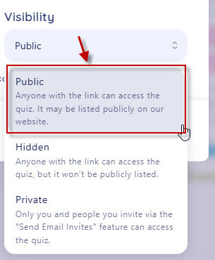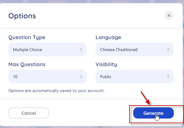 步驟4:選擇出題內容,類型(單選題、多選題、是非題、申論題、配對題)、題數(可選擇5-10題)、輸出語言、選擇Visibility(可見性 / 存取權限) 。