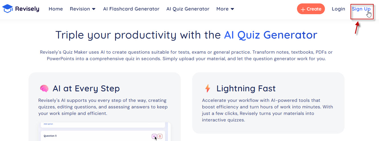 步驟1:連Revisely網站( https://www.revisely.com/quiz-generator),選擇右上角「Sign Up」後,進入註冊畫面。