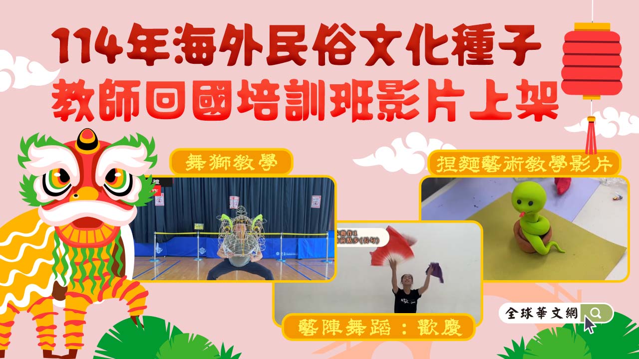 由僑務委員會主辦的「114年海外民俗文化種子教師回國培訓班」,規劃民俗藝術、民俗體育與民俗舞蹈等3個分組專業課程,目前相關課程錄影檔已上架全球華文網師資培訓影音專區,方便老師隨時點選觀看,彈性安排、自主研習。