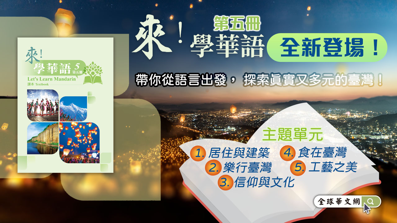 《來!學華語》第五冊現已上架全球華文網電子書城,歡迎前往下載試用,用華語閱讀臺灣,感受文化的多彩魅力