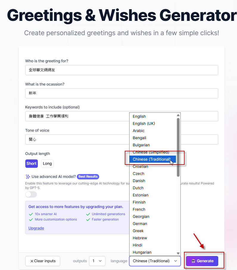 步驟3:選擇輸出語系[Chinese(Traditional)]繁體中文後,點選[Generate]開始生成。