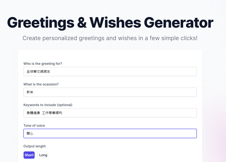 步驟2:在欄位中填寫祝福對象/情境/祝福關鍵字/語氣/選擇輸出長度(預設為短short)