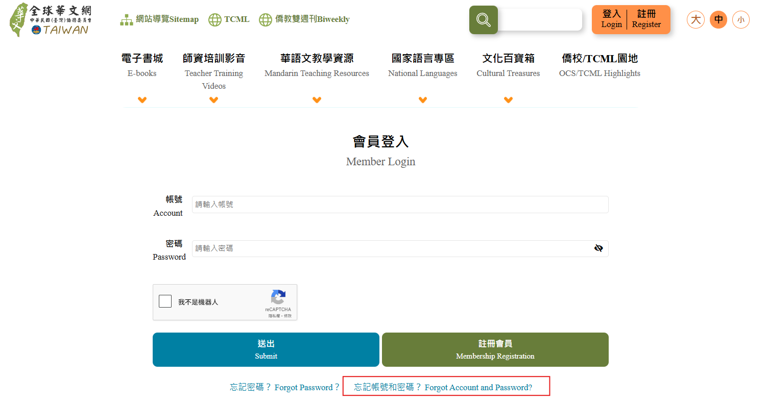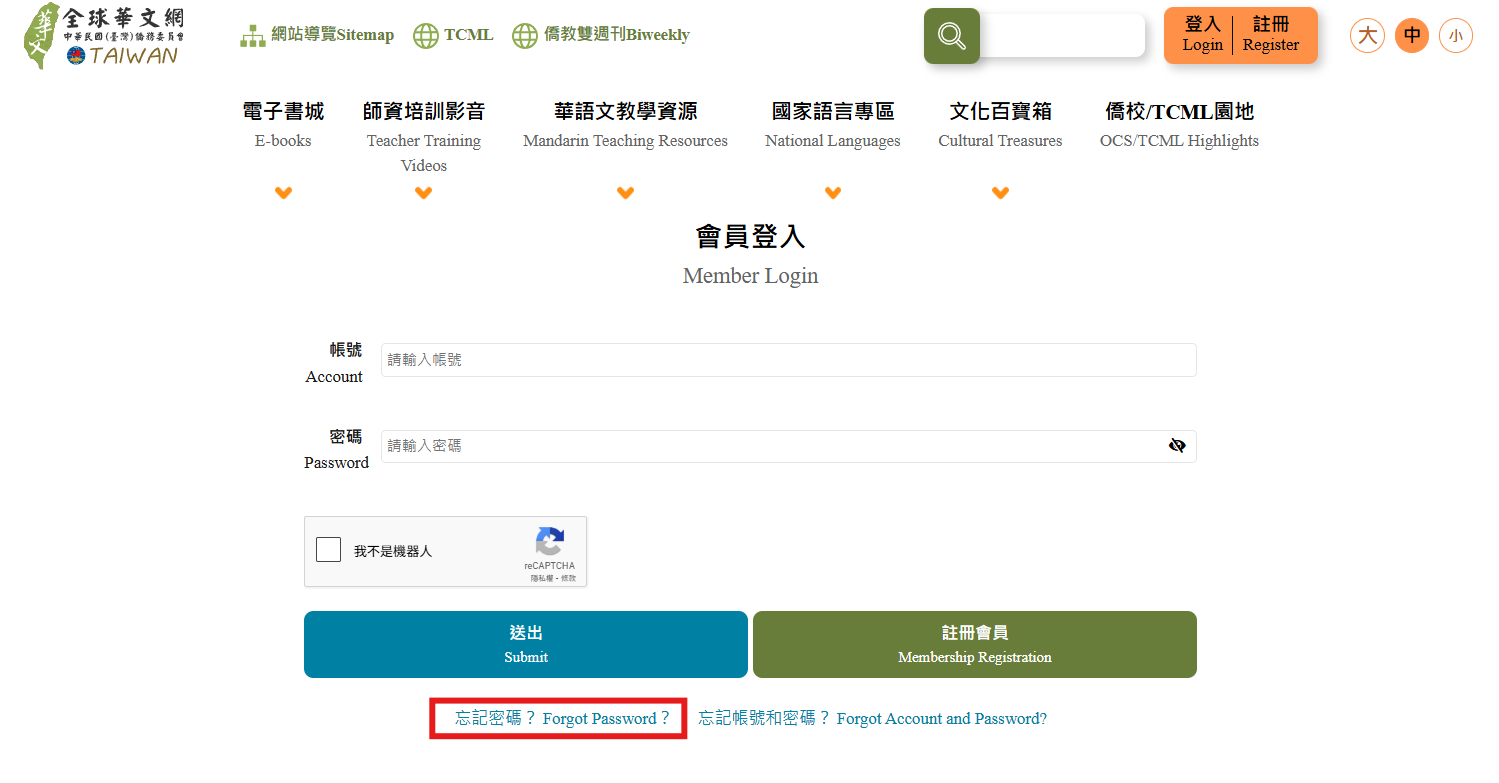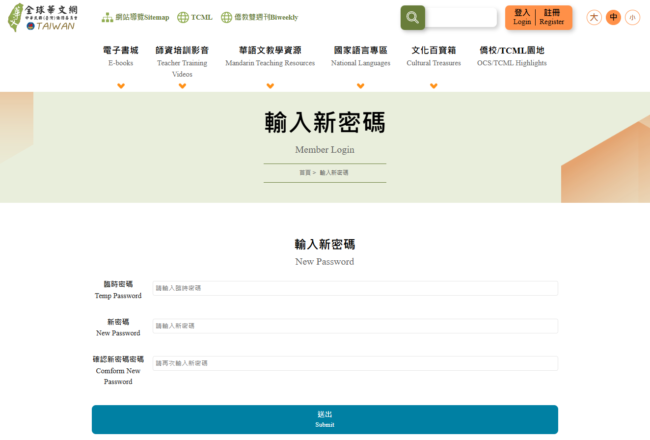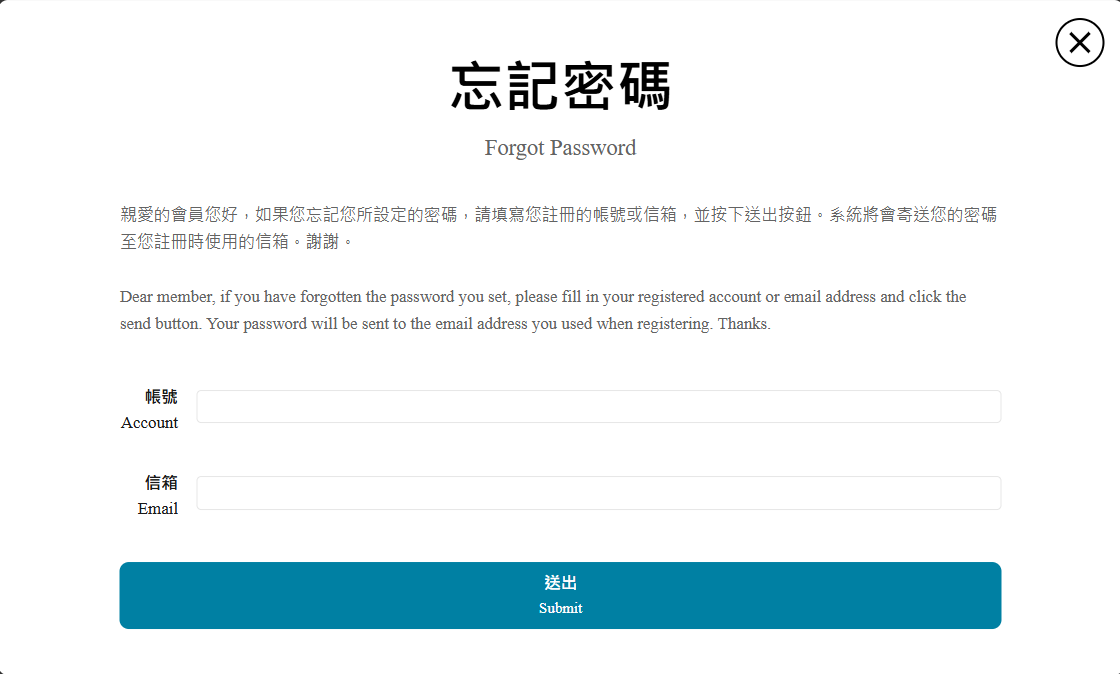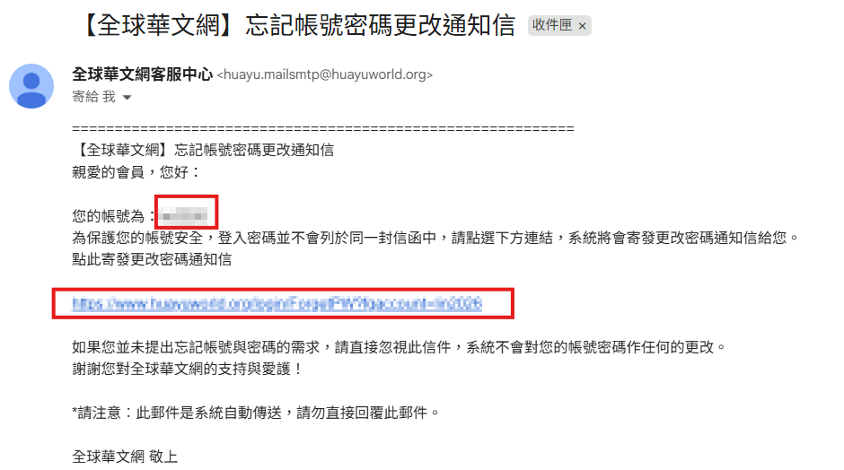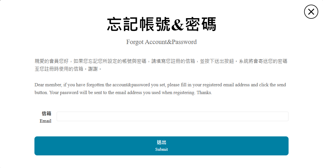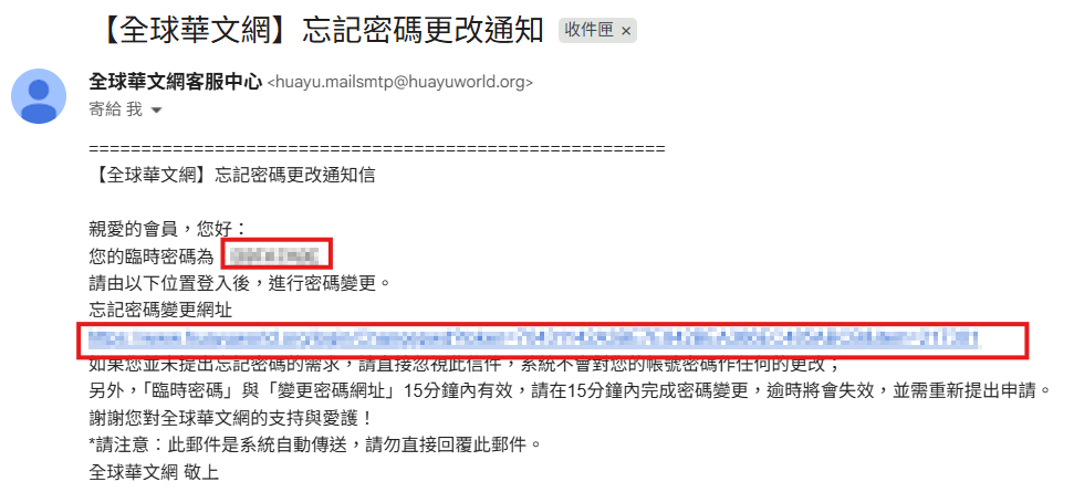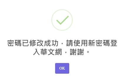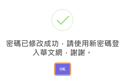 Q2:「忘記密碼」該怎麼辦? 步驟3:輸入您的「帳號」與「信箱」,點選「送出」,即可至您當初註冊所填寫的信箱收取您的密碼。 步驟4:至您當初註冊所填寫的信箱,收取「全球華文網」忘記密碼更改通知信。點擊信件內忘記密碼變更網址,至「輸入新密碼」頁面。 步驟5:填寫「步驟4」信件中提供的臨時密碼與您想更改的新密碼後,點選「送出」即完成密碼修改。 Q3:「忘記密碼與帳號」該怎麼辦? 步驟3:填寫您註冊的信箱,並按下「送出」按鈕。 步驟4:至您當初註冊所填寫的信箱,收取【全球華文網】忘記帳號密碼更改通知信。 步驟6:再次查看您的信箱是否有收到【全球華文網】忘記密碼更改通知信,並點擊信中忘記密碼變更網址,至「輸入新密碼」頁面。