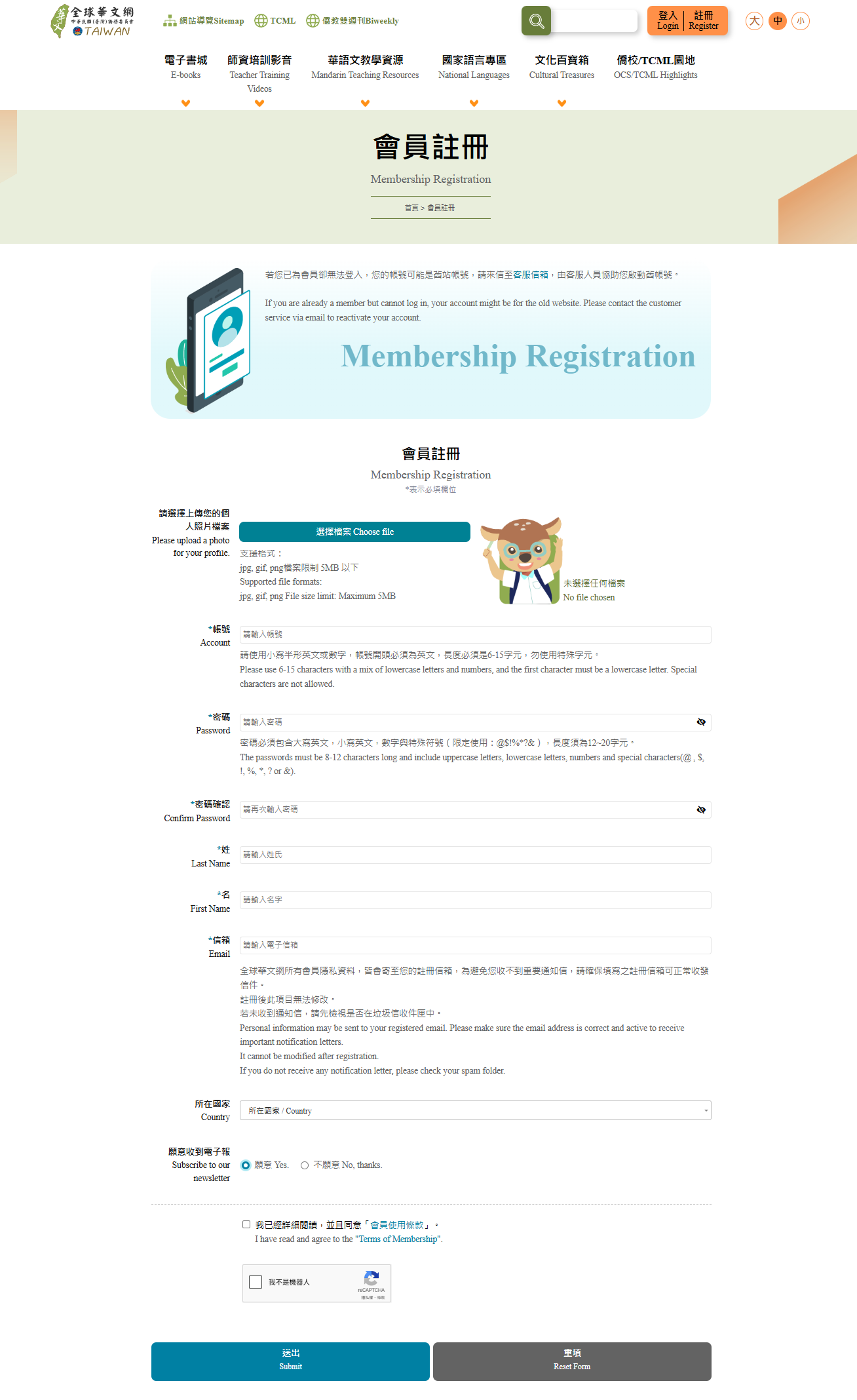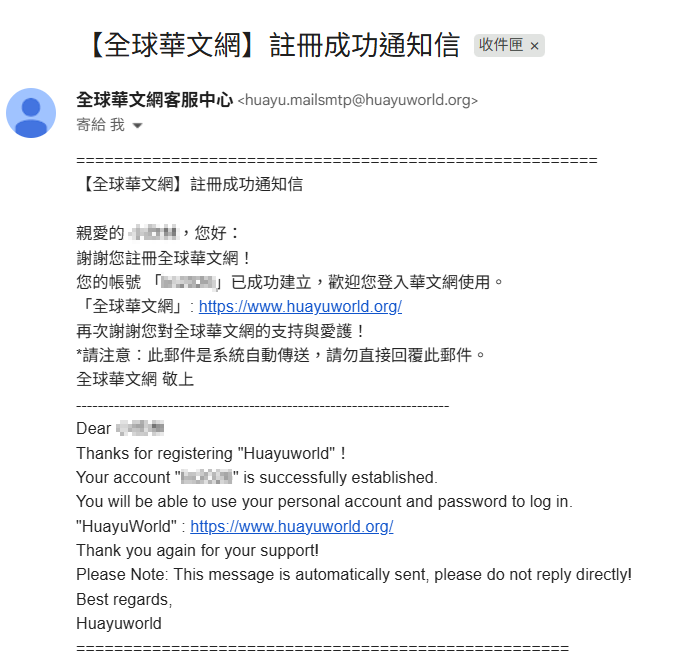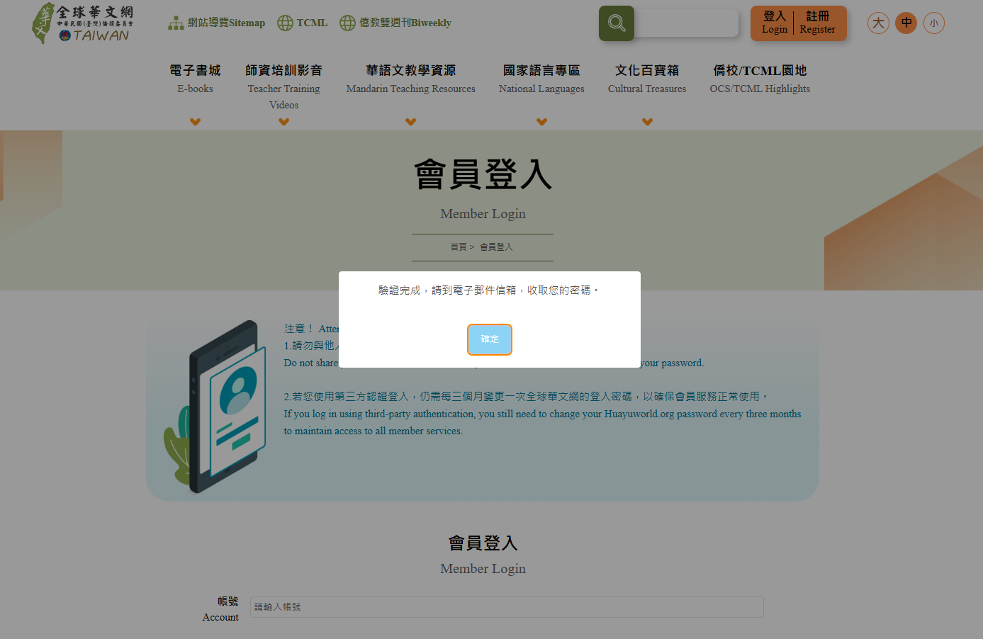 Q1:如何進行「全球華文網」會員註冊? 步驟1:點選首頁右上角「註冊」,進入「會員註冊」頁面。 步驟2:填寫相關資料,請注意以下帳號密碼設定相關規定。 ※帳號設定: 1.帳號開頭須為英文。 2.需使用小寫半形英文或數字。 3.長度必須是6-15字元。 4.勿使用特殊字元。 ※密碼設定: 1.需包含大寫英文,小寫英文,數字與特殊符號(限定使用:@$!%*?&)。 2.長度須為12~20字元。 小提醒: 1. 「全球華文網」採用「會員帳號」登入,請勿誤以電子郵件信箱作為帳號登入。 2. 若使用複製貼上方式輸入密碼,請留意是否誤含空白字元,以免造成登入失敗。 步驟3:填寫完畢後,點選「送出」,即可完成註冊步驟。系統也會同步發信至您所填寫的信箱,通知您已註冊成功。