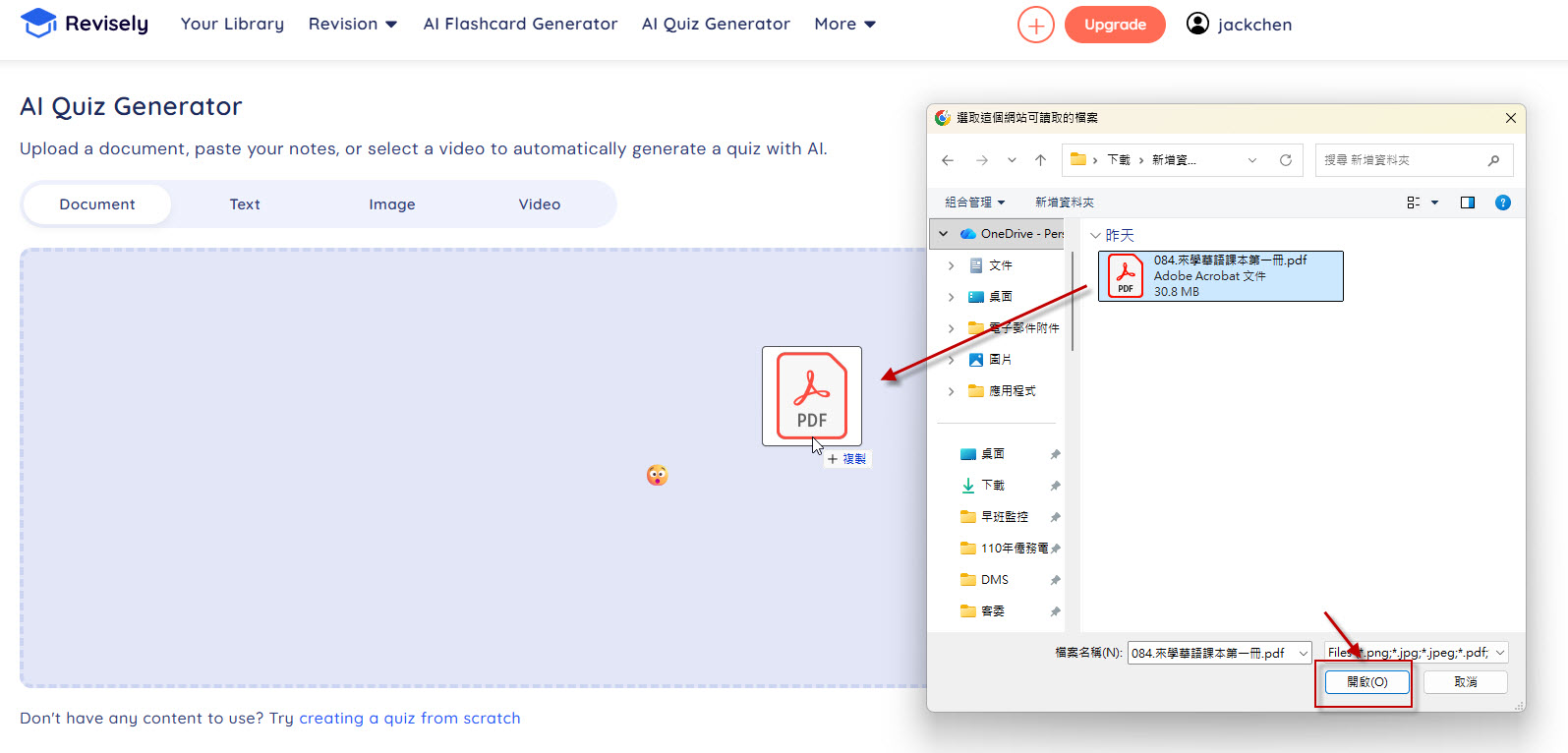首先選擇「Document」再點選「Drag a document here or click to browse」,將教材檔案(084.來學華語課本第一冊.pdf)選取或拖拉進行上傳。