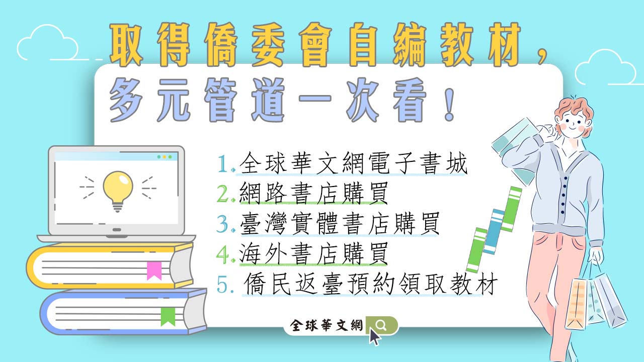 僑委會編撰的華語文教材,長期協助海外僑校教學、僑生來臺學習及全球華語學習者自學使用,內容完整、資源豐富。除了僑校可透過駐外單位申請,您還知道有其他方式可取得教材嗎?趕快跟著「全球華文網」一起了解取得僑委會自編教材的多元管道: