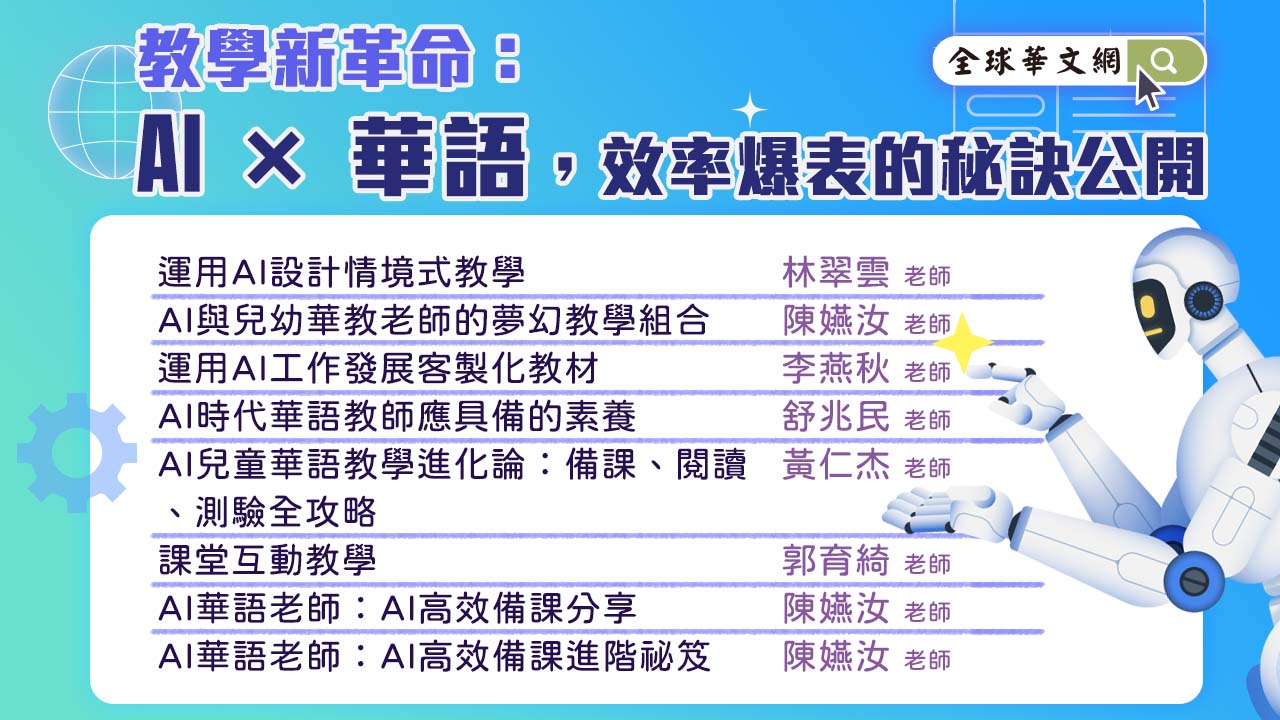 「全球華文網」精選多門AI×華語教學實用課程,從備課、教材設計到課堂互動,讓你的教學更高效、更創新、更吸睛!
