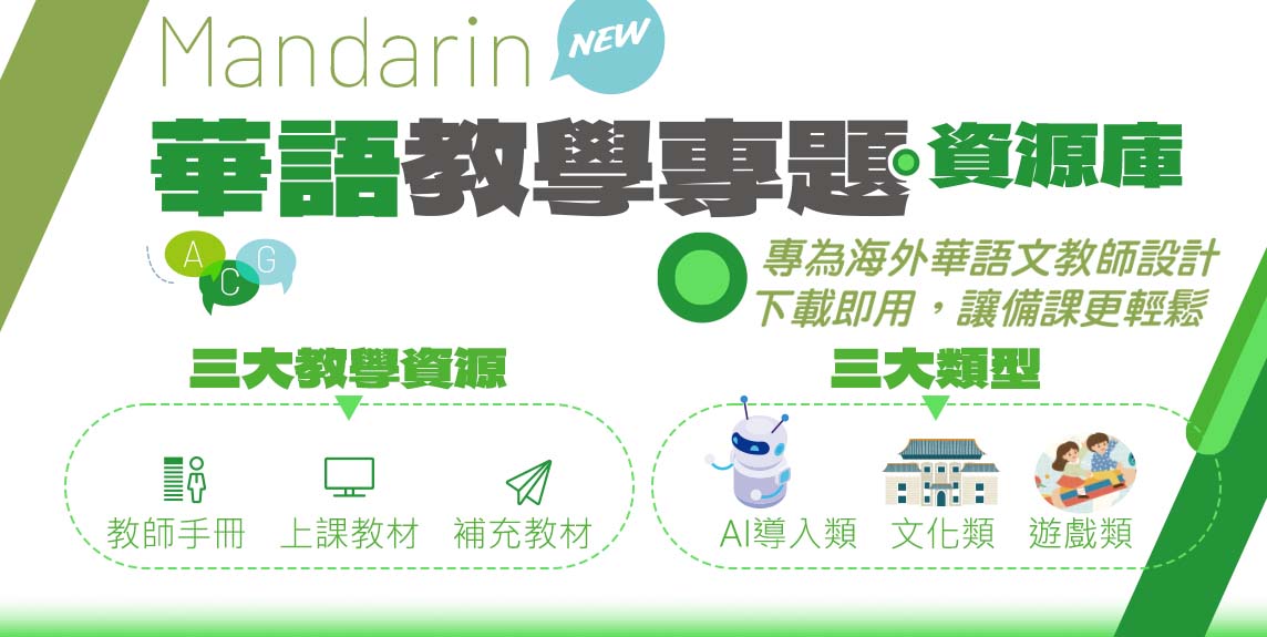 「華語教學專題資源庫」提供涵蓋「AI導入類、文化類、遊戲類」等三類教學專題,包含:華語教學方法與實務案例、AI 工具於教學中的應用示範、臺灣文化主題課堂活動,以及教學素材操作範例與實用模板等,協助僑校與 TCML 教師在不同教學情境中靈活運用,打造兼具互動性與創意的華語課堂。