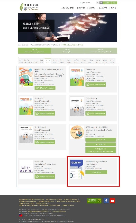 - Quizlet放置位置:首頁〉《學華語向前走》專區〉教材下載