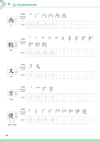 Lekcja 02 我想給爸爸媽媽買禮物 അන kolejność Г 西 kresek xī ᄳο Г Г 西 西 അන kolejność ༰ 較 kresek jiào ᄳο ༰ ༰ 較 較 അන kolejność ɦ 又 kresek yòu ᄳο ɦ ɦ 又 又 അන kolejność ˙ 方 kresek ᄳο ˙ ˙ 方 方 fāng അන kolejność ک 便 kresek 便 / 便 ᄳο ک ک 便 便 biàn / pián 14