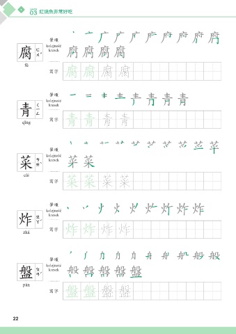 Lekcja 03 紅燒魚非常好吃 അන ၵ 腐 kolejność kresek fǔ ᄳο ၵ ၵ 腐 腐 അන kolejność ڡ 青 kresek qīng ᄳο ڡ ڡ 青 青 അන kolejność ൄ 菜 kresek cài ᄳο ൄ ൄ 菜 菜 അන kolejność ގ 札 kresek zhá ᄳο ގ ގ 炸 炸 അන kolejność ᆵ 盤 kresek pán ᄳο ᆵ ᆵ 盤 盤 22
