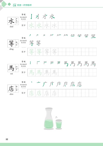 Lekcja 04 我要一杯熱咖啡 അන kolejność ˥ 水 kresek shuǐ ᄳο ˥ ˥ 水 水 അන kolejność ഃ 等 kresek děng ᄳο ഃ ഃ 等 等 അන kolejność ৵ 馬 kresek ᄳο ৵ ৵ 馬 馬 mǎ അන kolejność ֳ 店 kresek diàn ᄳο ֳ ֳ 店 店 32 32