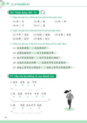 (1) 週 / 末 (2) 運 / 動 (3) 晚 / 網