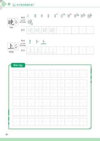 Lesson Bài học 06 06 你平常喜歡做什麼? 你平常喜歡做什麼? 筆順 quy tắc 筆順 bút thuận 晚 bút thuận quy tắc 晚 晚 wǎn wǎn 晚晚 晚 晚 晚 寫字 晚晚 晚 寫字 筆順 筆順 quy tắc bút thuận quy tắc 上 上 bút thuận 上 上上 上 上 上 寫字 shàng 寫字 上上 上 shàng Exercise Bài tập 42 42 42 42