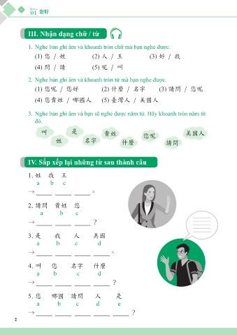(1) 您 / 姓 (2) 人 / 王 (3) 好 / 我