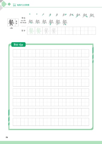 Lesson Bài học 08 08 祝你生日快樂 祝你生日快樂 筆順 餐 餐 bút thuận quy tắc cān 寫字 餐餐 餐 餐 Exercise Bài tập 58 58 58 58