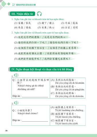 IV. Nghe đoạn hội thoại và chọn câu trả lời đúng