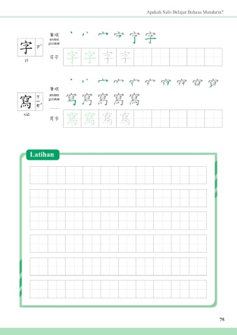 Apakah Sulit Belajar Bahasa Mandarin? Is It Hard to Learn Mandarin? 筆順 筆順 urutan urutan guratan 字 guratan 字 字 字字 字 字 字 寫字 zì zì 寫字 字字 字 筆順 筆順 urutan guratan urutan 寫 寫 guratan 寫 寫寫 寫 寫 寫 xiě xiě 寫字 寫寫 寫 寫字 Exercise Latihan 75 75