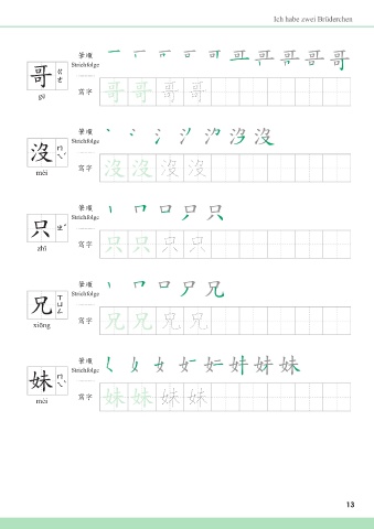 Ich habe zwei Brüderchen അන Strichfolge ࡩ 歌 gē ᄳο ࡩ ࡩ 哥 哥 അන Strichfolge Ӛ 沒 méi ᄳο Ӛ Ӛ 沒 沒 അන Strichfolge ̥ 只 zhǐ ᄳο ̥ ̥ 只 只 അන Strichfolge ̃ 兄 xiōng ᄳο ̃ ̃ 兄 兄 അන Strichfolge ֊ 妹 mèi ᄳο ֊ ֊ 妹 妹 13