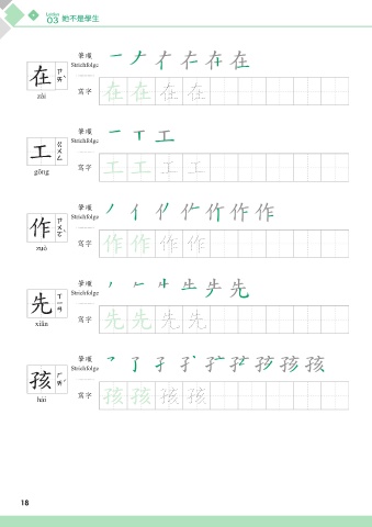 Lektion 03 她不是學生 അන Strichfolge ί 在 zài ᄳο ί ί 在 在 അන Strichfolge ʈ 工 gōng ᄳο ʈ ʈ 工 工 അන Strichfolge Ъ 作 zuò ᄳο Ъ Ъ 作 作 അන Strichfolge 先 xiān ᄳο 先 先 അන Strichfolge ܀ 孩 hái ᄳο ܀ ܀ 孩 孩 18