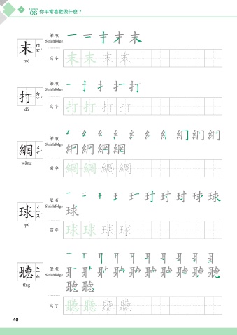 Lektion 06 你平常喜歡做什麼? അන Strichfolge ͋ 末 mò ᄳο ͋ ͋ 末 末 അන Strichfolge ͂ 打 dǎ ᄳο ͂ ͂ 打 打 അන ၣ 網 Strichfolge wǎng ᄳο ၣ ၣ 網 網 അන ଢ 球 Strichfolge qiú ᄳο ଢ ଢ 球 球 ᛓ 聽 Strichfolge അන tīng ᛓ ᛓ 聽 聽 ᄳο 40