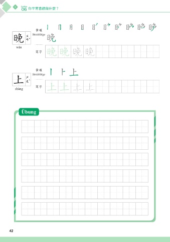 Lektion 06 你平常喜歡做什麼? അන ૉ 晚 Strichfolge wǎn ᄳο ૉ ૉ 晚 晚 അන Strichfolge ɪ 上 shàng ᄳο ɪ ɪ 上 上 Übung 42 42