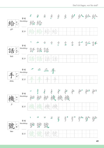 Darf ich fragen, wer Sie sind? അන ഗ 給 Strichfolge gěi ᄳο ഗ ഗ 給 給 അන ༑ 話 Strichfolge huà ᄳο ༑ ༑ 話 話 അන Strichfolge ˓ 手 ᄳο ˓ ˓ 手 手 shǒu അන ዚ 機 Strichfolge jī ᄳο ዚ ዚ 機 機 അන 號 Strichfolge hào ᄳο 號 號 49