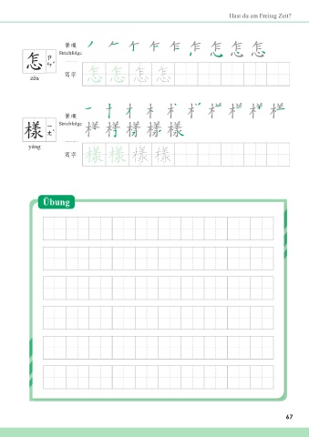 Hast du am Freitag Zeit? അන ܣ 怎 Strichfolge zěn ᄳο ܣ ܣ 怎 怎 അන ᅵ 樣 Strichfolge yàng ᄳο ᅵ ᅵ 樣 樣 Übung 67