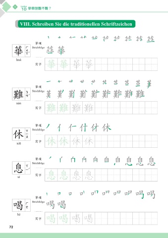 Lektion 10 學華語難不難? VIII. Schreiben Sie die traditionellen Schriftzeichen അන ശ 華 Strichfolge huá ᄳο ശ ശ 華 華 അන ᗭ 難 Strichfolge nán ᄳο ᗭ ᗭ 難 難 അන ; 修 Strichfolge xiū ᄳο ; ; 休 休 അන Strichfolge ࢹ 習 xí ᄳο ࢹ ࢹ 息 息 അන ఀ 喝 Strichfolge hē ᄳο ఀ ఀ 喝 喝 72