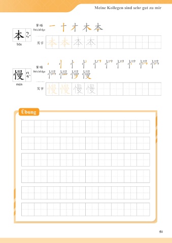 My Colleagues Are Very Good to Me Meine Kollegen sind sehr gut zu mir 筆順 筆順 stroke order Strichfolge 本 本 本 本 本 本 本 本 寫字 本本 本 běn běn 寫字 筆順 筆順 慢 慢 stroke order Strichfolge 慢 màn màn 慢 慢 慢 慢 慢 寫字 慢慢 慢 寫字 Exercise Übung 51 51