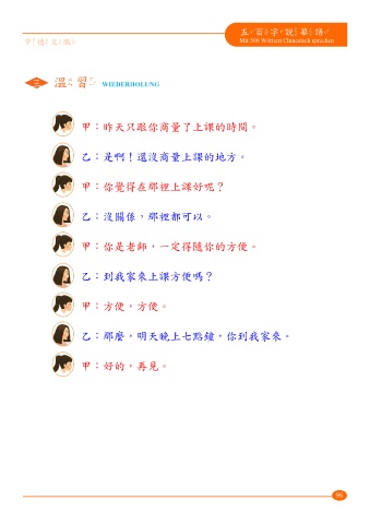 五百字說華語 中德文版 Mit 500 Wörtern Chinesisch sprechen 三 溫習 WIEDERHOLUNG 甲:昨天只跟你商量了上課的時間。 乙:是啊!還沒商量上課的地方。 甲:你覺得在那裡上課好呢? 乙:沒關係,那裡都可以。 甲:你是老師,一定得隨你的方便。 乙:到我家來上課方便嗎? 甲:方便,方便。 乙:那麼,明天晚上七點鐘,你到我家來。 甲:好的,再見。 96