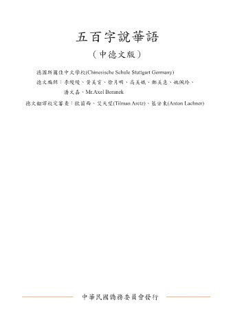 五百字說華語 (中德文版) 德國斯圖佳中文學校(Chinesische Schule Stuttgart Germany) 德文編輯:李縵縵、黃美育、徐月明、高美娥、鄭美惠、姚佩玲、 潘文嘉、Mr.Axel Beranek 德文翻譯校定審查:歐茵西、艾天望(Tilman Aretz)、藍安東(Anton Lachner) 中華民國僑務委員會發行