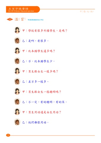 五百字說華語 Mit 500 Wörtern Chinesisch sprechen 中德文版 三 溫習 WIEDERHOLUNG 四 應用 ANWENDUNG 甲:學校有很多外國學生,是嗎? 乙:是啊,有很多。 甲:比本國學生還多嗎? 乙:不,比本國學生少。 甲:男生跟女生一樣多嗎? 乙:差不多一樣多。 甲:男生跟女生一樣聰明嗎? 乙:不一定,有的聰明,有的笨。 甲:男生用功還是女生用功? 乙:他們都很用功。 51