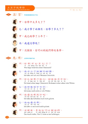甲:你學中文多久了? 乙:我才學了兩個月。你學了多久了? 甲:我已經學了三年了。 丙:我還沒學呢! 甲:沒關係,你可以到我們學校來學。 甲