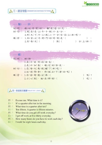 王: Ten fi fteen. A quarter is fi fteen minutes.