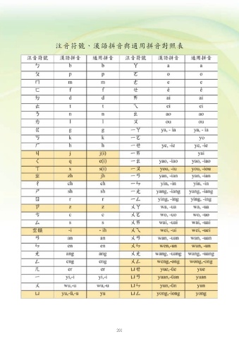 注音符號、漢語拼音與通用拼音對照表 201