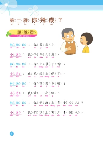 林 伯 伯 : 你 幾 歲 ? 小 月 : 我 的 老 師 是 女 的 。