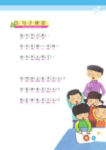 三 讀讀看 四 句子練習 Let's read Sentence exercise 我今年六歲。 我今年六歲。 我今年六歲 我今年六歲 我讀一年級。 你今年讀一年級。 我讀一年級 你今年讀一年級 我是女生(男生)。 他今年上學了。 我是女生 男生 他今年上學了 我長得胖胖的(瘦瘦的)。 我長得胖胖的 瘦瘦的 我長得高高的(矮矮的)。 你們班上有多少人? 我長得高高的 矮矮的 你們班上有多少人 猜猜我是誰? 你家裡有多少人? 猜猜我是誰 你家裡有多少人 教室裡有多少人? 教室裡有多少人 7 8