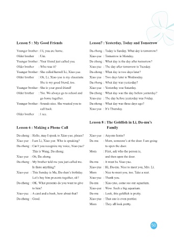 Xiao-yue : I am in the 1st grade. Older brother : Why don’t you use yours? Da-zhong : Hello, may I speak to Xiao-yue, please? Xiao-yue : Anyone home?