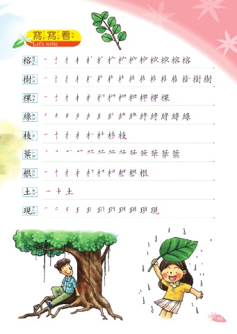 寫寫看 Let's write 榕 樹 棵 綠 枝 葉 根 土 枝生根,根又生枝,榕樹生生 枝生根 根又生枝 榕樹生生 現 不息,又高又大,給這片美麗的土 不息 又高又大 給這片美麗的土 地帶來了更多綠意。 地帶來了更多綠意 我愛榕樹, 更愛在榕樹下乘 我愛榕樹 更愛在榕樹下乘 涼,呼吸那新鮮的空氣。 涼 呼吸那新鮮的空氣 44 45
