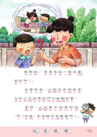 小朋友走了以後,小明問媽 媽媽說:「因為他差一點兒撞