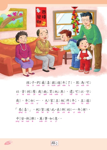 寫寫看 Let's write 農 曆 圓 夕 飯 食 糕 孩子們最喜歡過年了,因為可 孩子們最喜歡過年了 因為可 長 以拿到壓歲錢買玩具,還可以守 以拿到壓歲錢買玩具 還可以守 歲 歲。年初一,大家互相拜年,互道 歲 年初一 大家互相拜年 互道 拜 「恭喜」,祝賀彼此在新的一年裡, 恭喜 祝賀彼此在新的一年裡 平安快樂、萬事如意。 平安快樂 萬事如意 52 拜 53