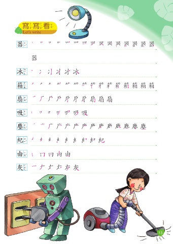 寫寫看 電器用品愈來愈多,雖然在 Let's write 電器用品愈來愈多 雖然在 器 生活上帶給我們不少方便,但是 生活上帶給我們不少方便 但是 使用各種電器時,也要注意安全。 使用各種電器時 也要注意安全 冰 箱 扇 吸 塵 紀 由 灰 12 13