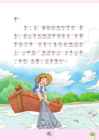 到湖裡去捕魚。他只要撒兩次網, 小。心裡想:「網洞改小,大魚小魚