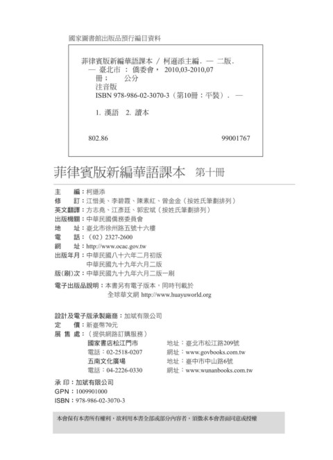 菲 律賓版新編華語課本 / 柯遜添主編. -- 二版.