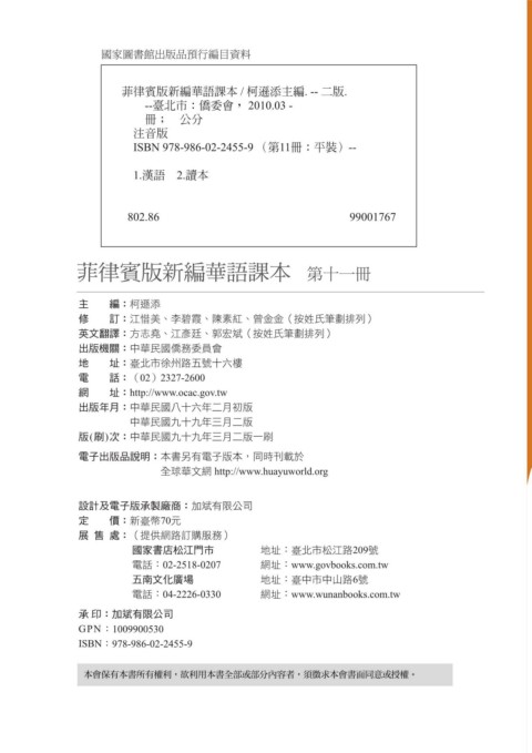 菲 律賓版新編華語課本 / 柯遜添主編. -- 二版.