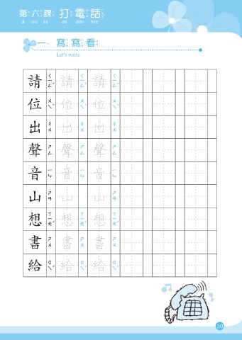 第六課 打電話 第 五課 打 電 話 六 聽寫練習 一 寫寫看 Listening and writing exercise Let's write 請 請 請 請 請 請 位 位 位 位 位 位 出 出 出 出 出 出 聲 聲 聲 聲 聲 聲 音 音 音 音 音 音 山 山 山 山 山 想 想 想 想 想 想 書 書 書 書 書 書 給 給 給 給 給 給 家長簽名: 老師簽章: 家長簽名 老師簽章 00