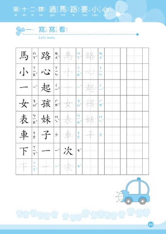 第十二課 過馬路要小心 第 十 二 課 過 馬 路 要 小 心 六 聽寫練習 一 寫寫看 Listening and writing exercise Let's write 馬 馬 路 路 馬 馬 路 路 小 小 心 心 小 小 心 心 一 毅 起 起 一 一 起 起 女 女 孩 孩 女 女 孩 孩 表 表 妹 妹 表 表 妹 妹 車 車 子 子 車 車 子 子 下 下 一 疑 次 次 下 下 一 一 次 次 家長簽名: 老師簽章: 家長簽名 老師簽章